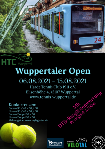 Vom 06.08.2021 – 15.08.2021 finden die Wuppertaler Open mit DTB-Ranglistenwertung statt! Gespielt wird in folgenden Konkurrenzen:
